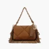 Borsa a spalla in ecopelle con lavorazione a rombi cuciti e frange, manico in catena infilato in ecopelle e tracolla rimovibile. Questa borsa unisce stile e funzionalità, diventando l’accessorio ideale per ogni occasione.